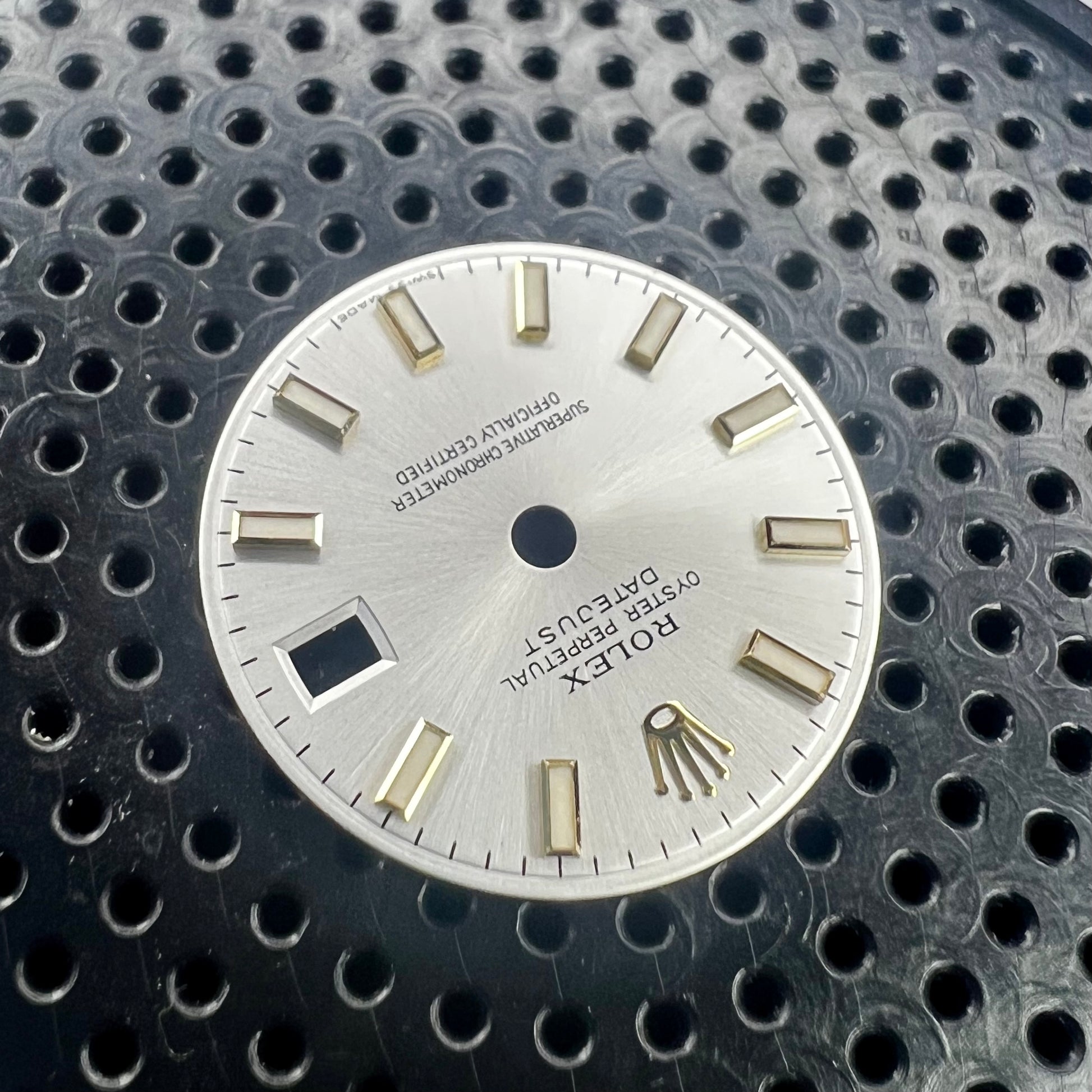 This authentic Rolex dial was removed from a more recent model and is fully compatible with the Rolex Datejust 26, supporting Calibers 2235, 2135 and 2035 movements. This dial features a single opening on the reverse side, indicating it was designed for the 2235 movement. However, with a minor modification, it can be adapted to fit virtually any Rolex Datejust 26 model ever produced.