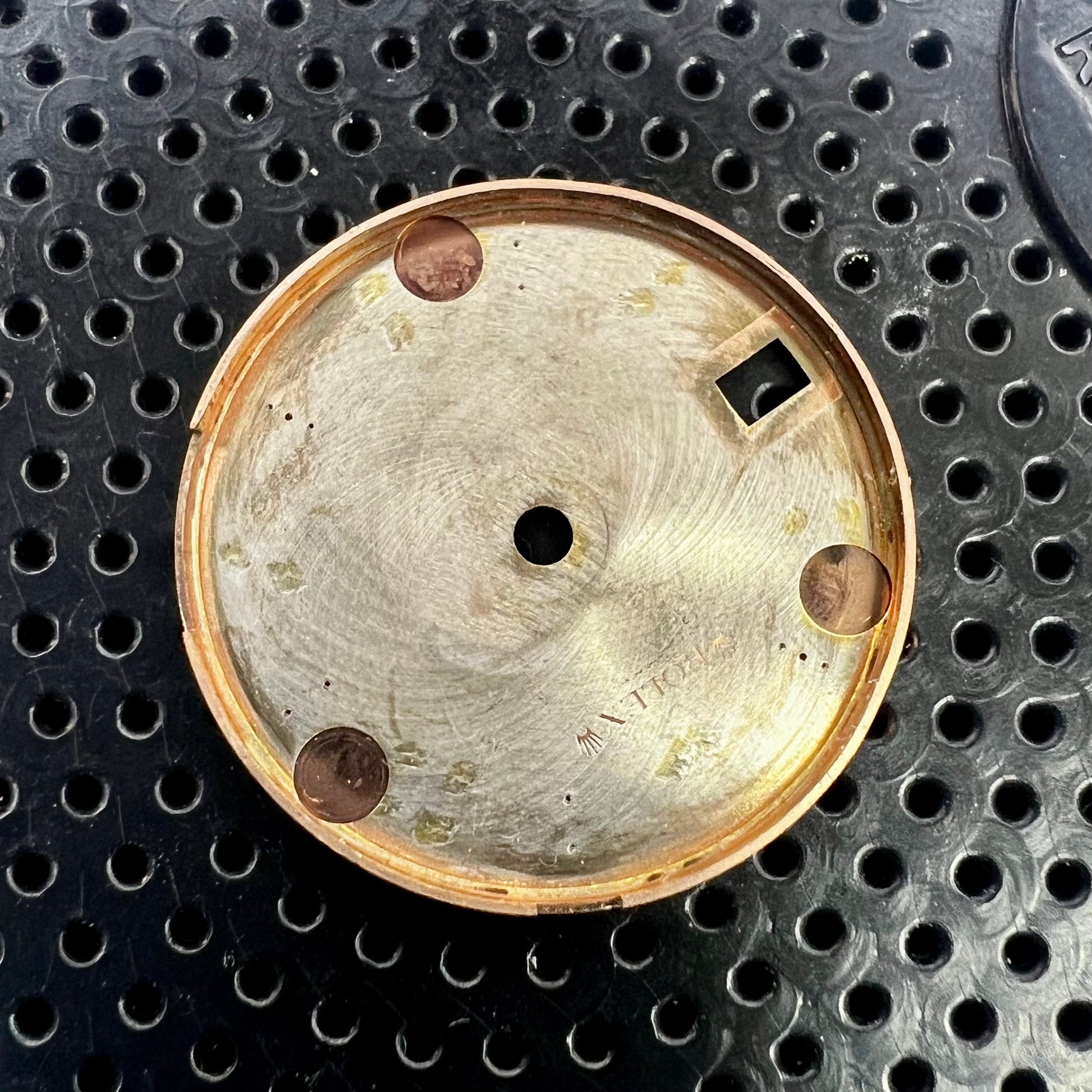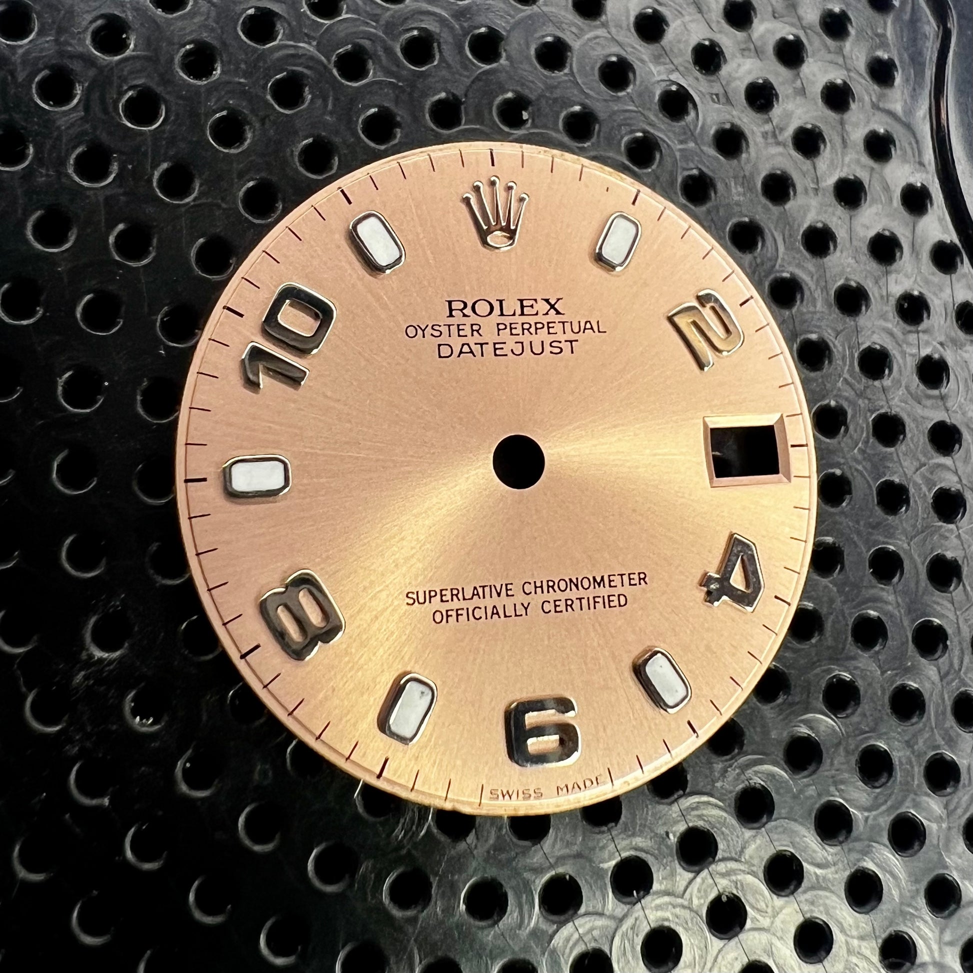 This dial is a well-preserved example of a Rolex Datejust 31 salmon dial (sometimes called "pink" or "copper"), featuring a unique combination of Arabic numerals and bar-shaped hour markers (filled with Luminova for enhanced visibility in low light). Its warm salmon tone pairs beautifully with stainless steel or white gold cases, making it a versatile choice for restoration or customization. The dial surface is clean and free of major damage or discoloration. However, it's worth noting that the 4-minute hash mark is partially missing, and there are minor particles visible on some of the Luminova inserts — a common occurrence in pre-owned dials that does not affect functionality or overall appearance. This piece is ideal for collectors, watchmakers, or enthusiasts seeking an authentic and distinctive dial for their midsize Datejust.