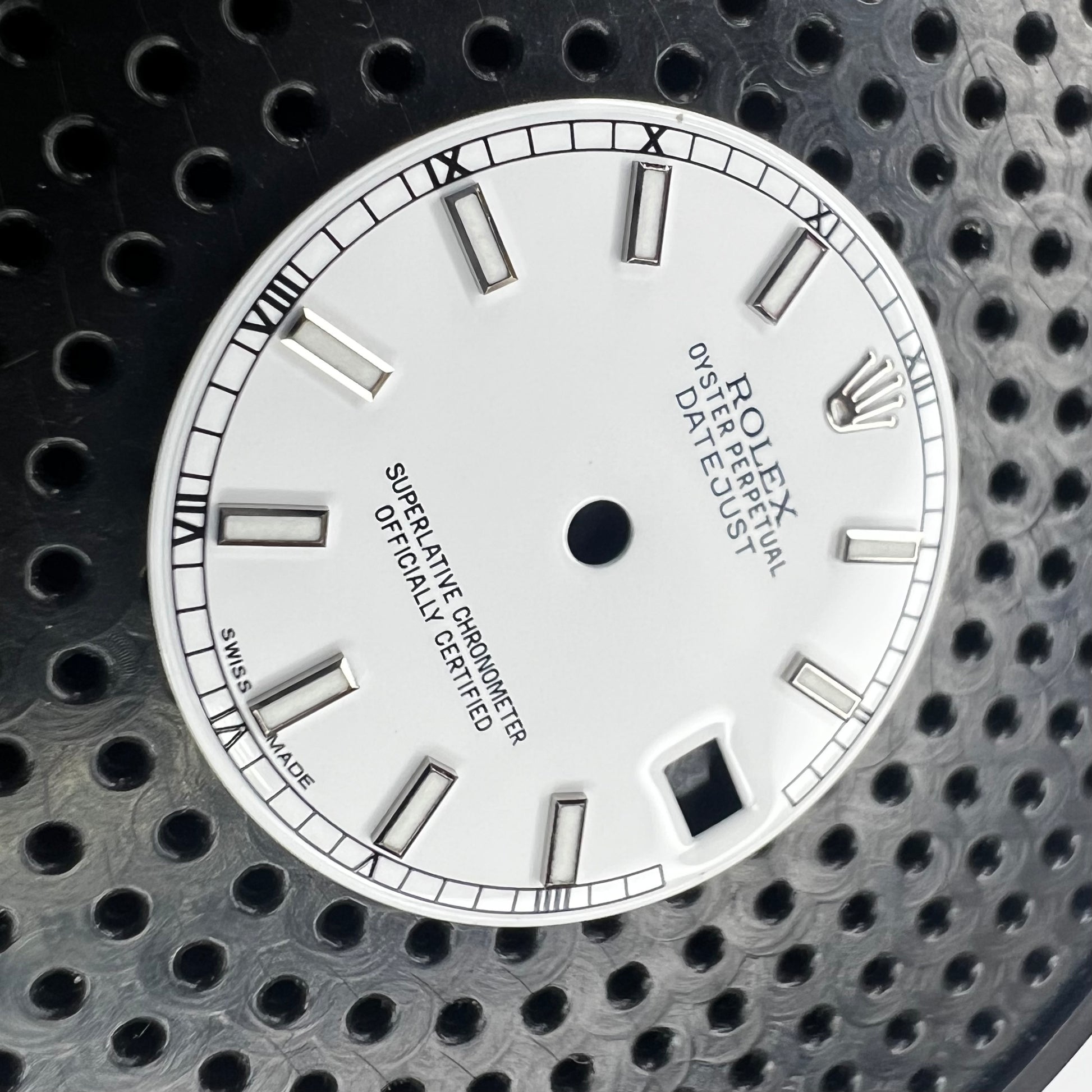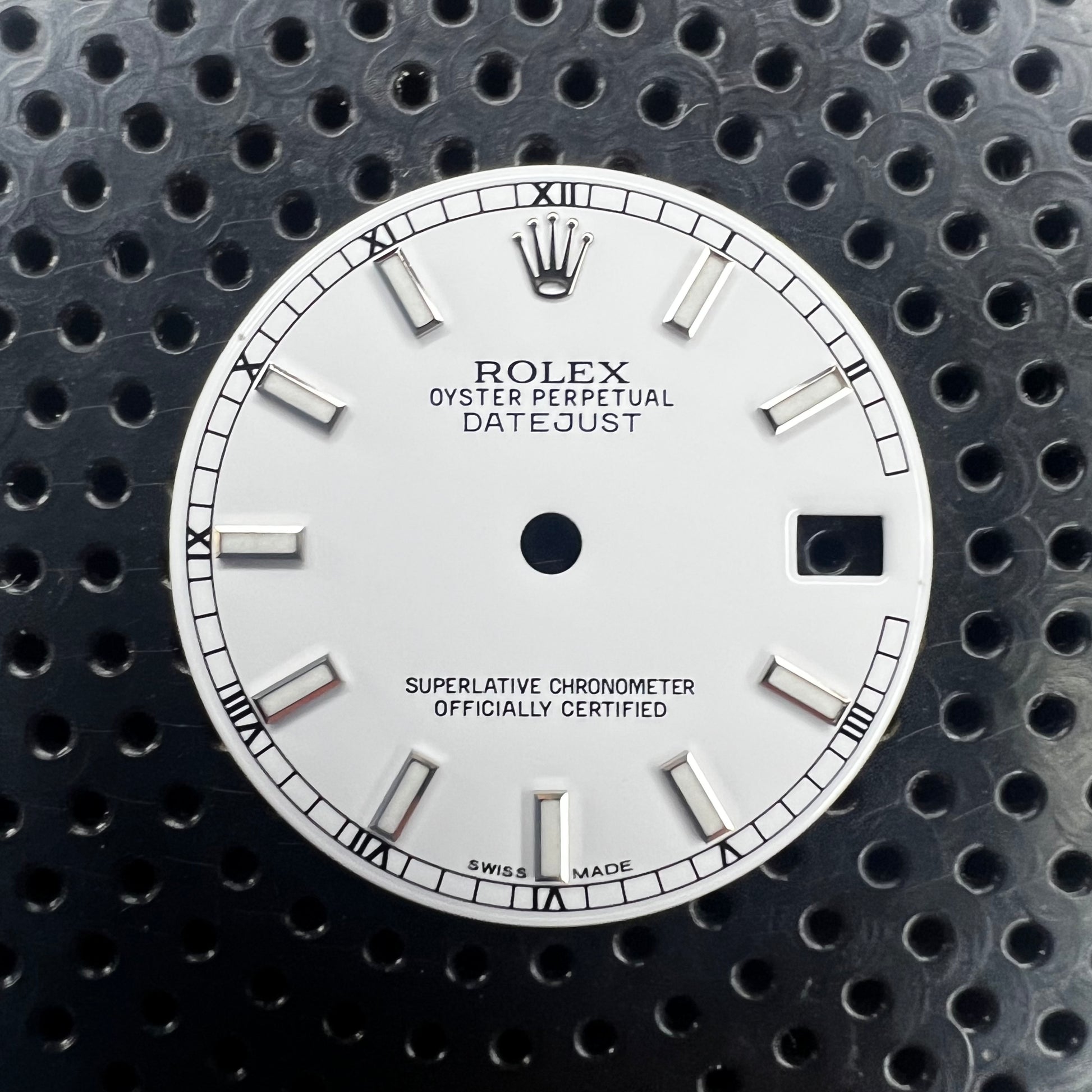 This authentic Rolex dial was removed from a more recent model and is fully compatible with any Rolex Datejust 31 with minor modifications, supporting calibers 2035, 2135, and 2235 movements. However, this particular dial was manufactured for 2235 movement.