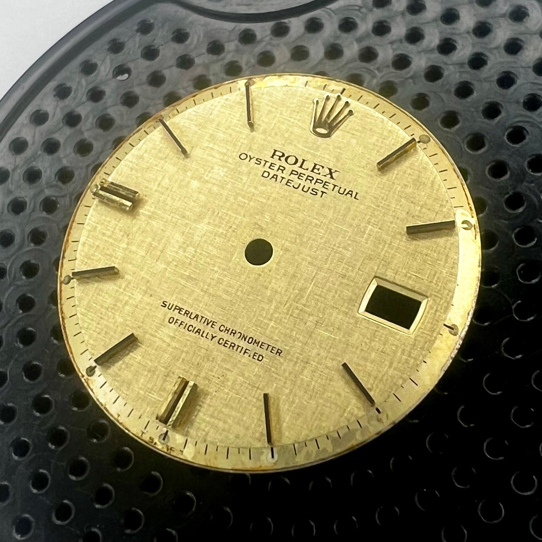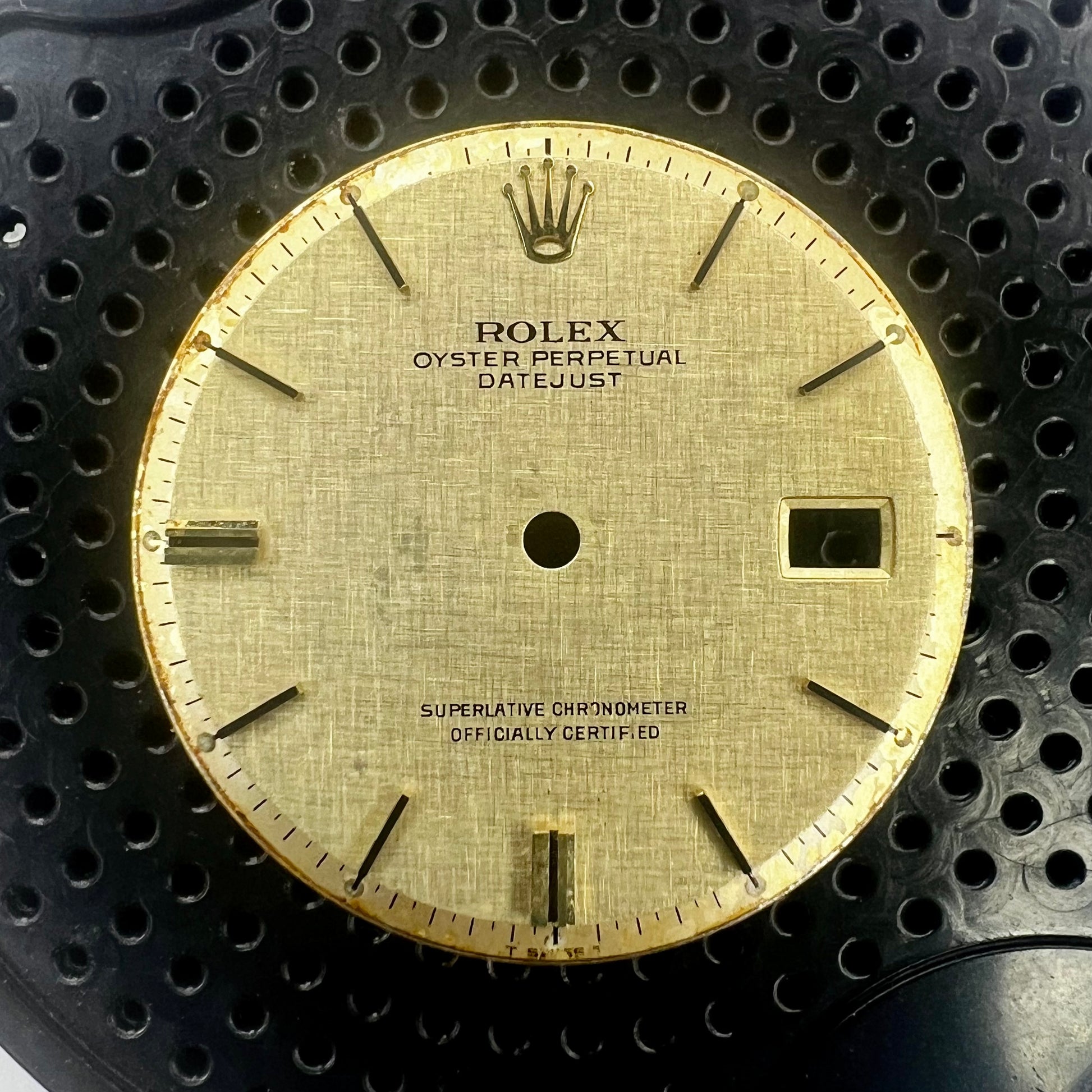 This authentic Rolex dial was removed from a vintage model 1601 (AKA "Non-Quick"). Please, make no mistake this older dial won't fit Rolex Datejusts with 3035 or 3135 movements, but it is fully compatible with any vintage (manufactured prior to 1978) Rolex Datejust 36mm (1601), supporting Caliber 1575 (and its variants) movement.