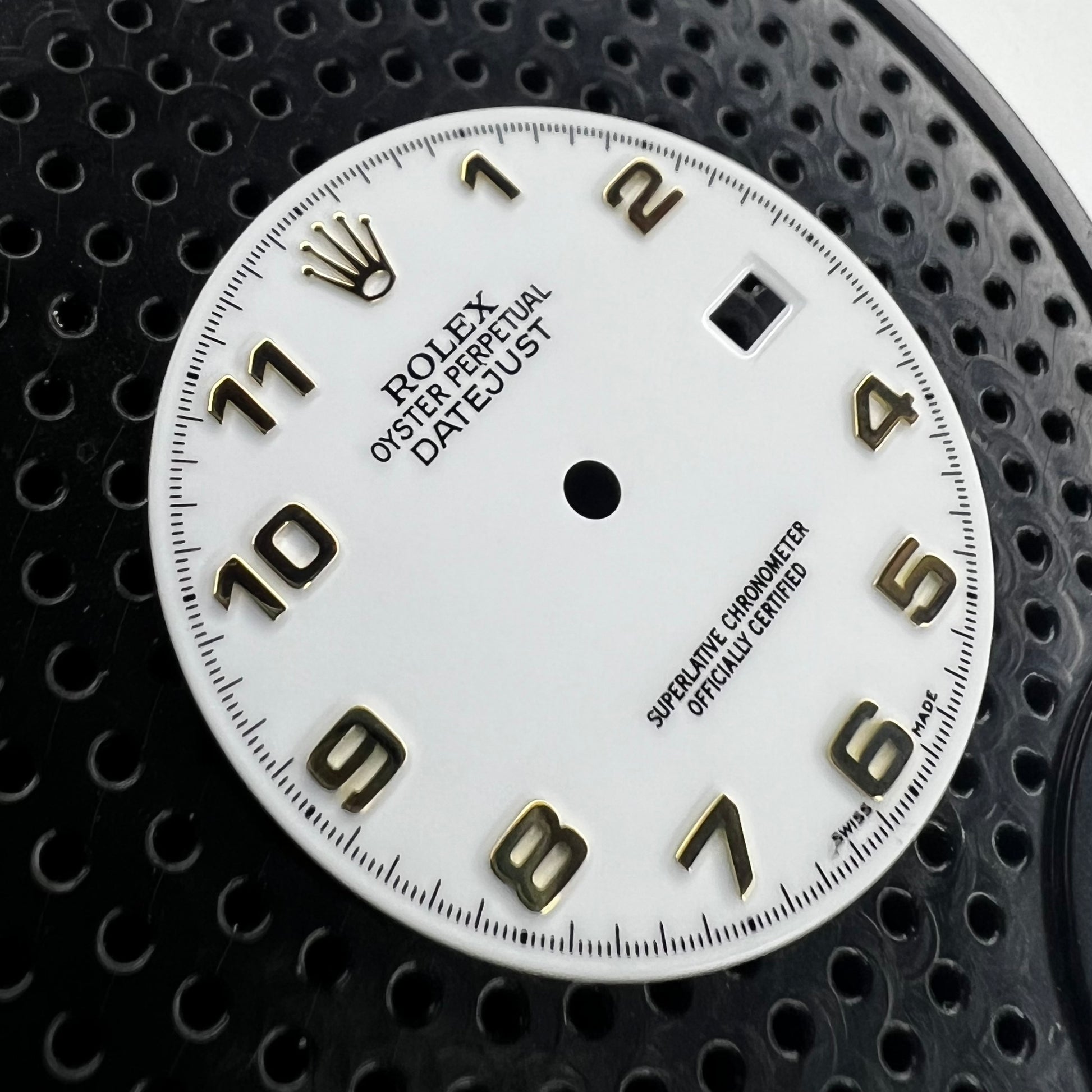 This authentic Rolex dial was removed from an older two-tone model (most likely 16013) and is fully compatible with the Rolex Datejust 36mm, supporting both Caliber 3135 and Caliber 3035 movements.
