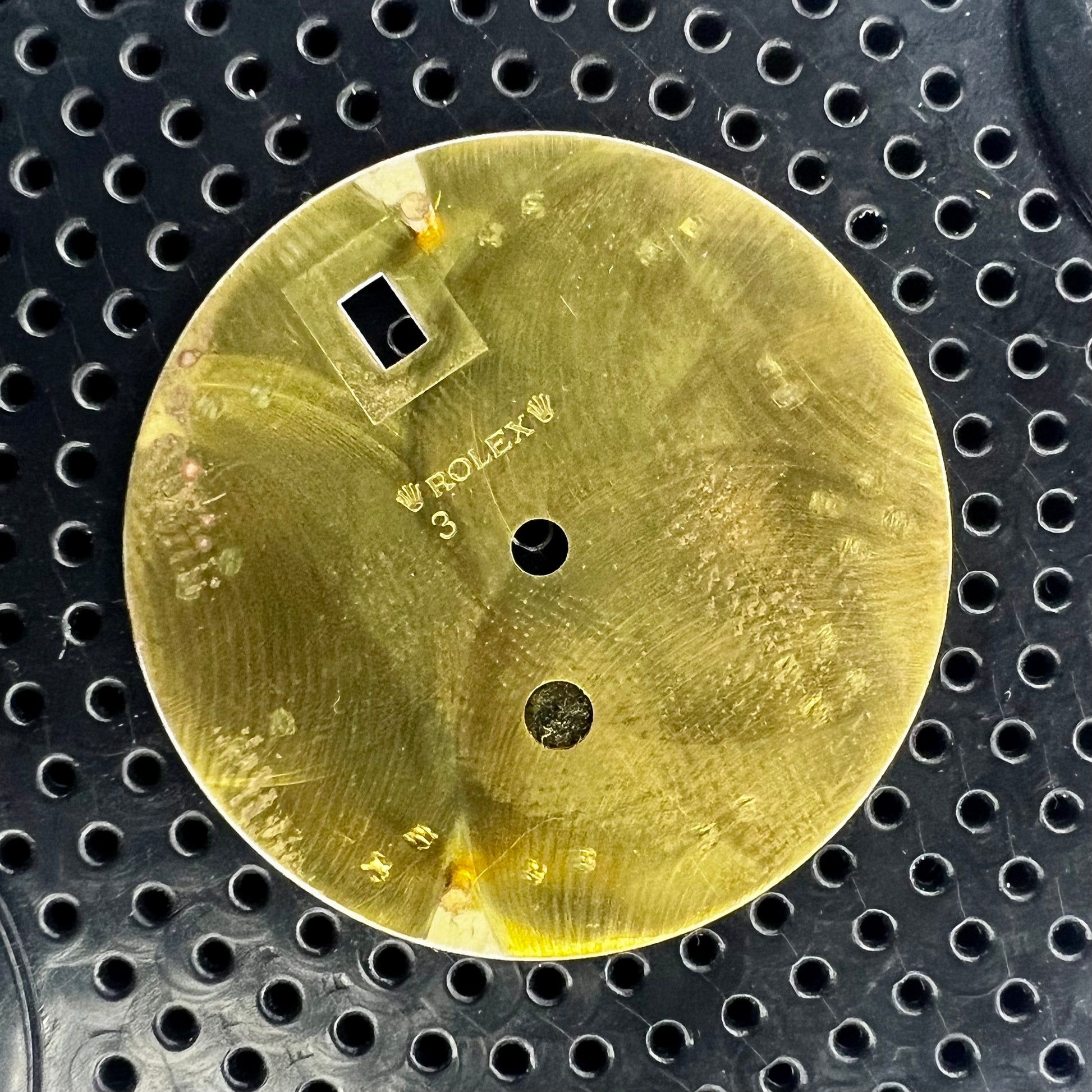 I had never encountered this particular dial design before and was initially convinced it was just another counterfeit. However, after a thorough examination, I’m confident in its authenticity. First, the weight is consistent with genuine Rolex dials - counterfeit versions are typically much lighter and made from thinner metal. Second, the print quality is unmistakably authentic, with crisp detailing and precise alignment. And finally, there’s an engraving on the reverse side that closely resembles the style Rolex used in the 1990s, further supporting its legitimacy.