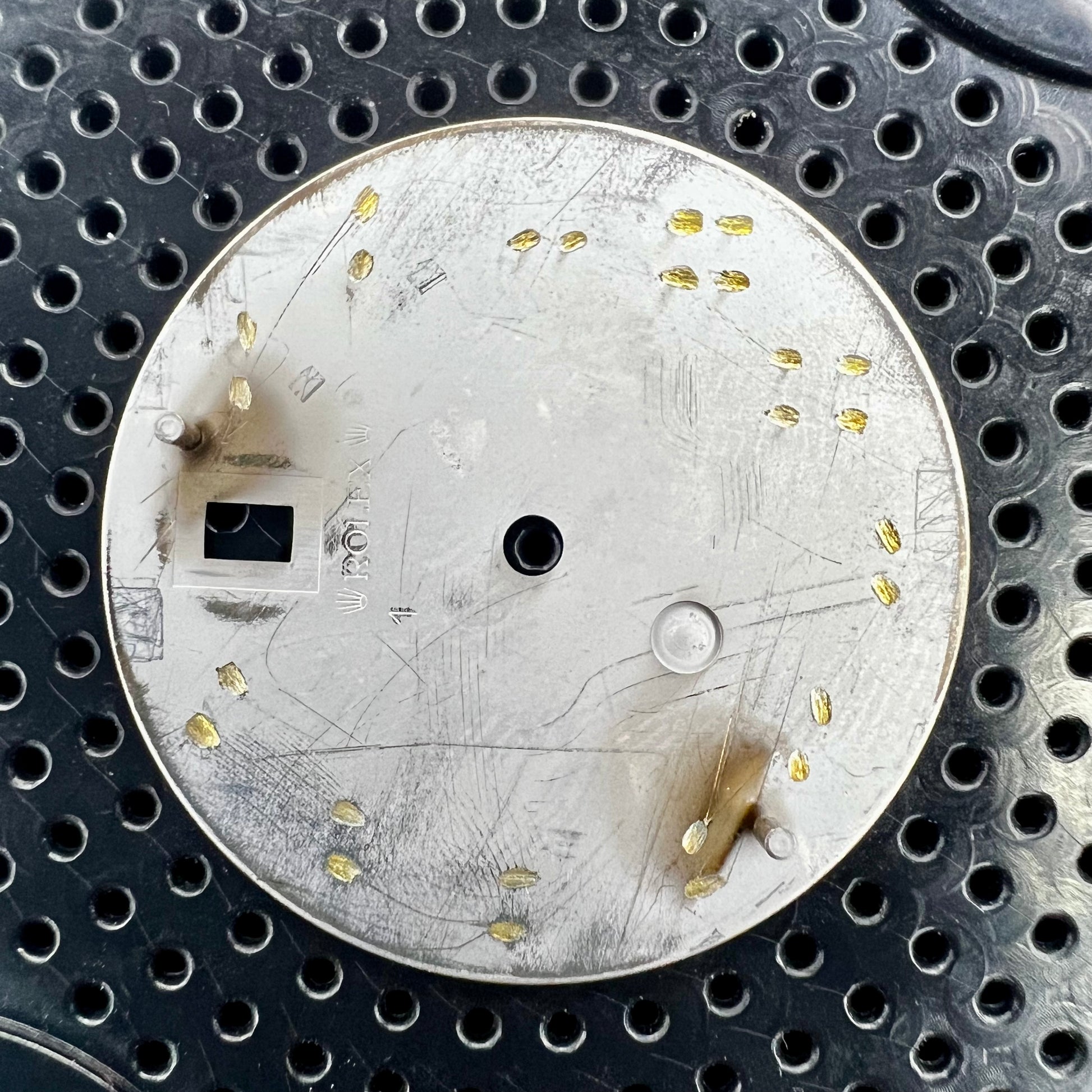 I had never encountered this particular dial design before and was initially convinced it was just another counterfeit. However, after a thorough examination, I’m confident in its authenticity. First, the weight is consistent with genuine Rolex dials - counterfeit versions are typically much lighter and made from thinner metal. Second, the print quality is unmistakably authentic, with crisp detailing and precise alignment. There’s an engraving on the reverse side that closely resembles the style Rolex used in the early 1990s, further supporting its legitimacy. And finally the way the Arabic numerals are attached to the dial is unmistakably Rolex-style - aftermarket dials usually have the hour markers glued on.
